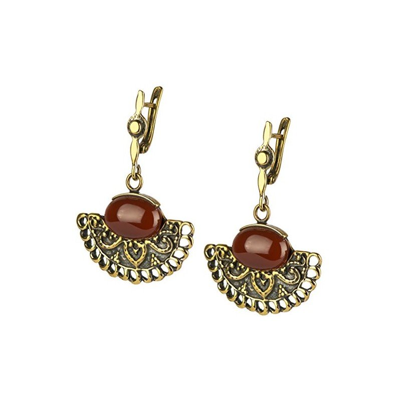 Латунные серьги в форме веера с драгоценным камнем — сердоликом.